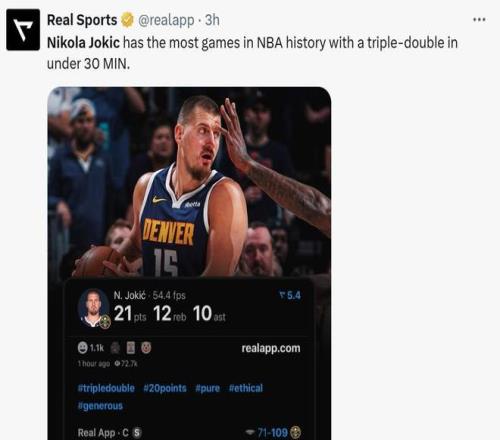 近兩個賽季約基奇就拿到了38次三雙,其中上賽季34次,本賽季4次,各項三雙數據均為同期聯盟第一,同時本場也是約基奇過去兩個賽季第23次在前三節就拿到三雙,同樣位列聯盟第一。